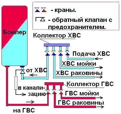 Собственно, ничего хитрого в подключении бойлера нет. К нему подводят три трубы: 1.- подача холодной воды (ХВС), 2.- отвод горячей воды (ГВС), 3.- отвод воды от предохранительного клапана в канализацию. На схеме показано включение бойлера между коллекторами ХВС и ГВС. Для примера, добавлены возможные потребители: смеситель раковины ванной комнаты и смеситель мойки на кухне. Если вы монтируете распределенную схему (на тройниках), принципиально, ничего не меняется. Нельзя забывать, что, перекрыв подачу воды на бойлер, вы перекрываете полностью ГВС (если у вас нет параллельного подключения от центрального ГВС).