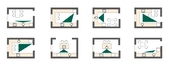 Необходимо рассчитывать расстояние от кухонного гарнитура до других предметов мебели с учетом открывания шкафов и выдвижения ящиков.