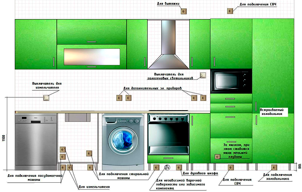 При расстановке оборудования заложите пространство, на котором вы и будете готовить. Минимально это пространство - 50 см, а комфортное - около метра.